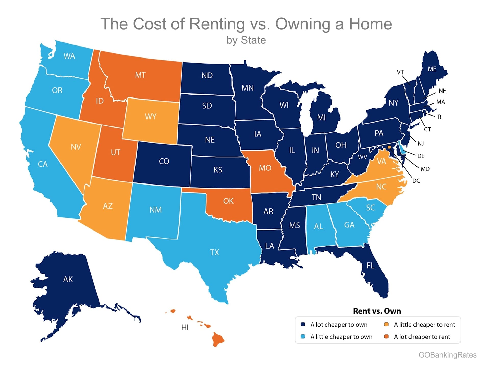 A study by GoBankingRates looked at the cost of renting vs. owning a home at the state level and concluded that in 39 states, it is a little’ or ‘a lot’ cheaper to own (represented by the two shades of blue in the map below).