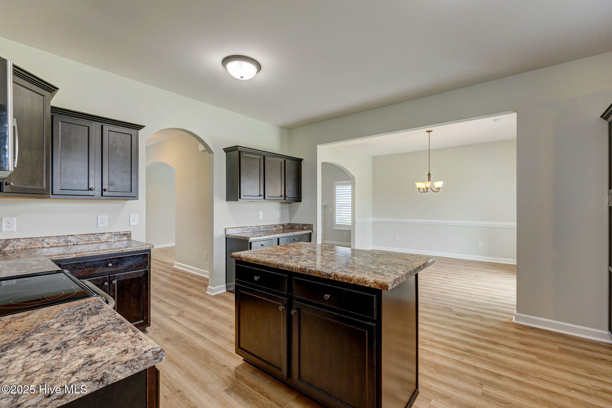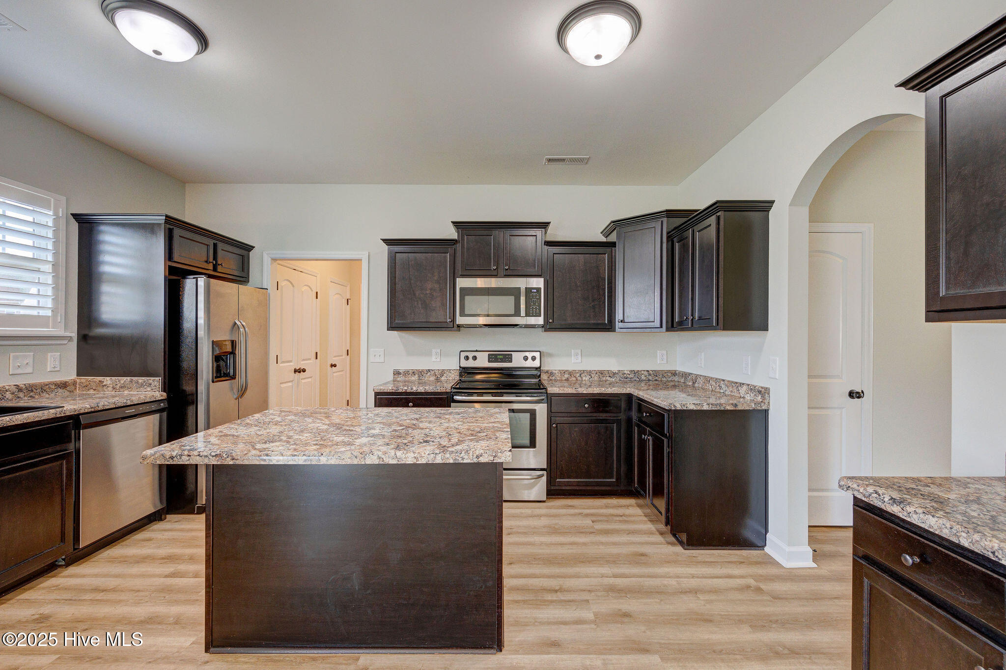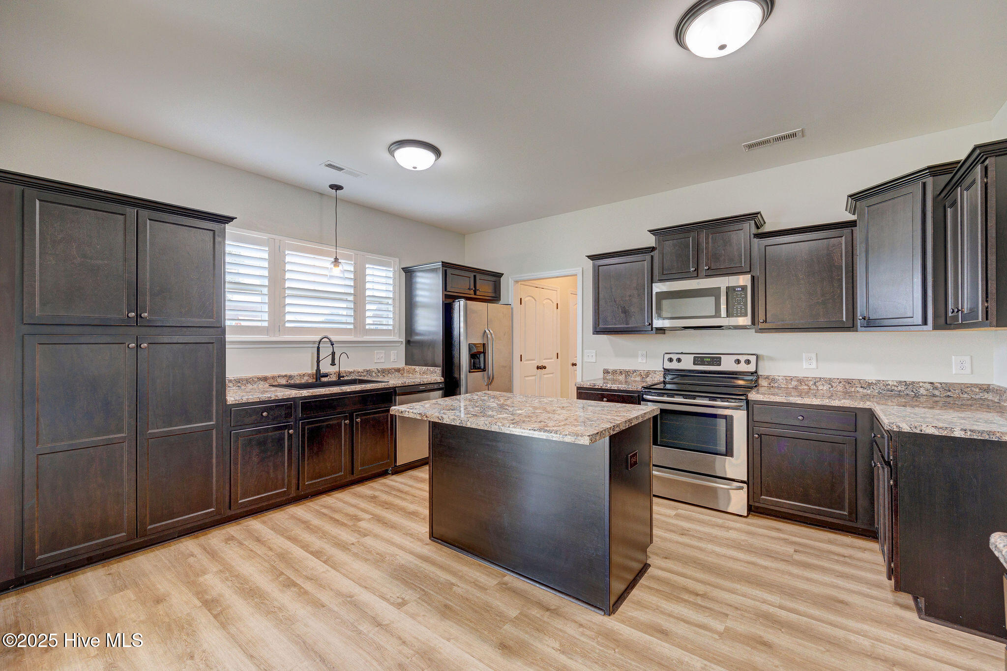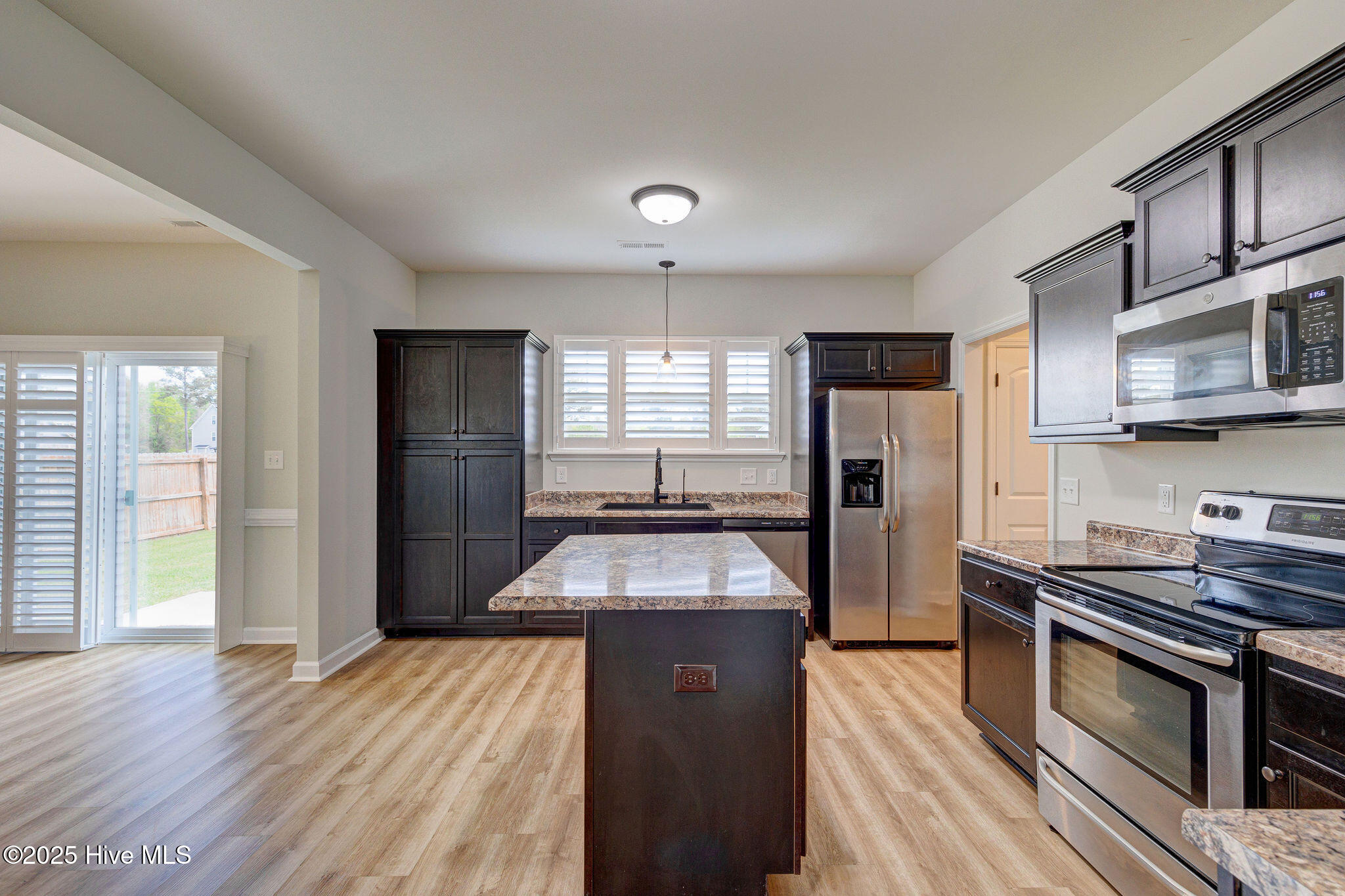 The heart of the home is the spacious kitchen, complete with a functional center island perfect for prepping meals, baking with the kids, or gathering with friends. Sleek dark cabinetry, stainless steel appliances, and generous storage make it both stylish and highly practical. A conveniently located half bath on the main level adds ease for guests.