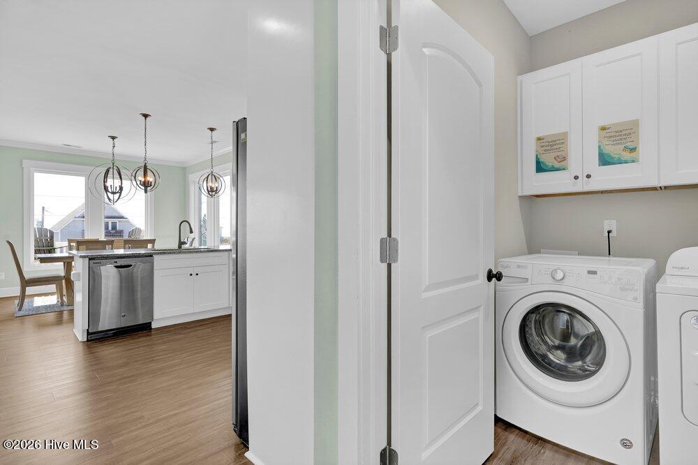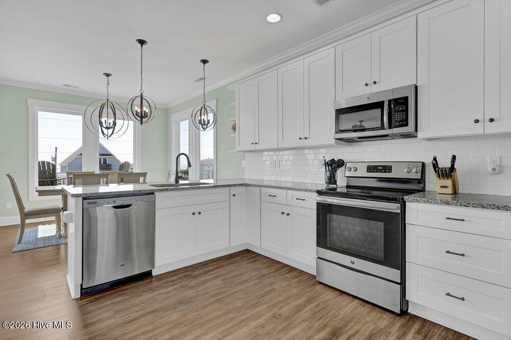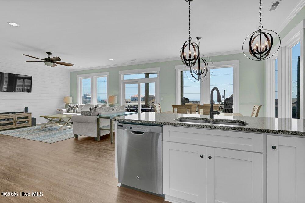 The main living level features an open-concept layout connecting the kitchen, dining, and living spaces, with stainless steel appliances, a walk-in pantry, ample cabinetry, and multiple dining areas including indoor and outdoor seating. Shiplap accents, subway tile, and calming coastal finishes throughout the home reflect a relaxed coastal farmhouse style that feels both comfortable and timeless.