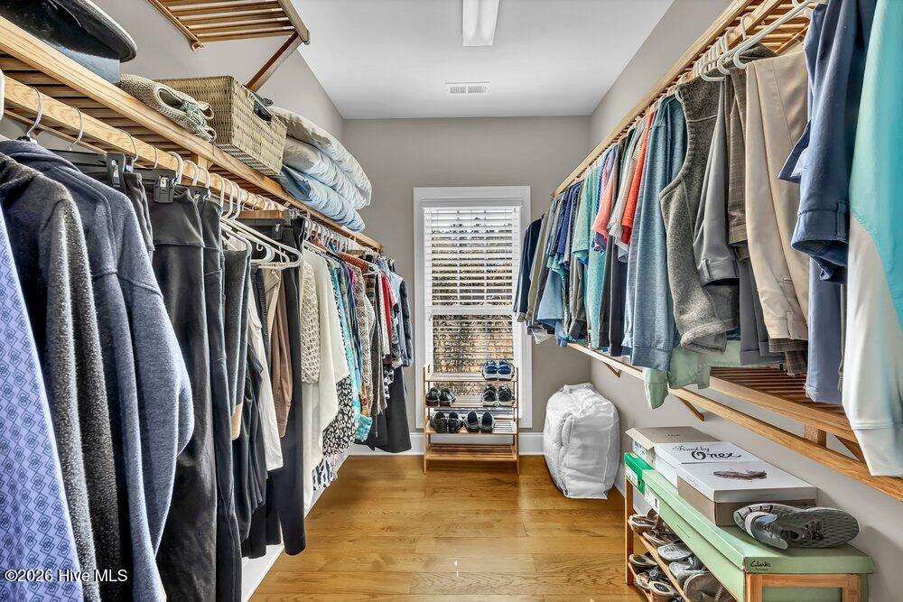 The primary suite is thoughtfully positioned for privacy, creating a comfortable retreat with generous space and a large walk-in closet filled with natural light. The en-suite bath has a spa-like feel, featuring a soaking tub and a zero-entry frameless glass shower designed for both comfort and ease of use. Two additional bedrooms offer flexibility for guests, a bonus room, or space for hobbies, while thoughtful storage solutions throughout the home--including a conveniently located climate-controlled storage room, laundry room, walk-in attic, and attached garage--support an organized, easy lifestyle.