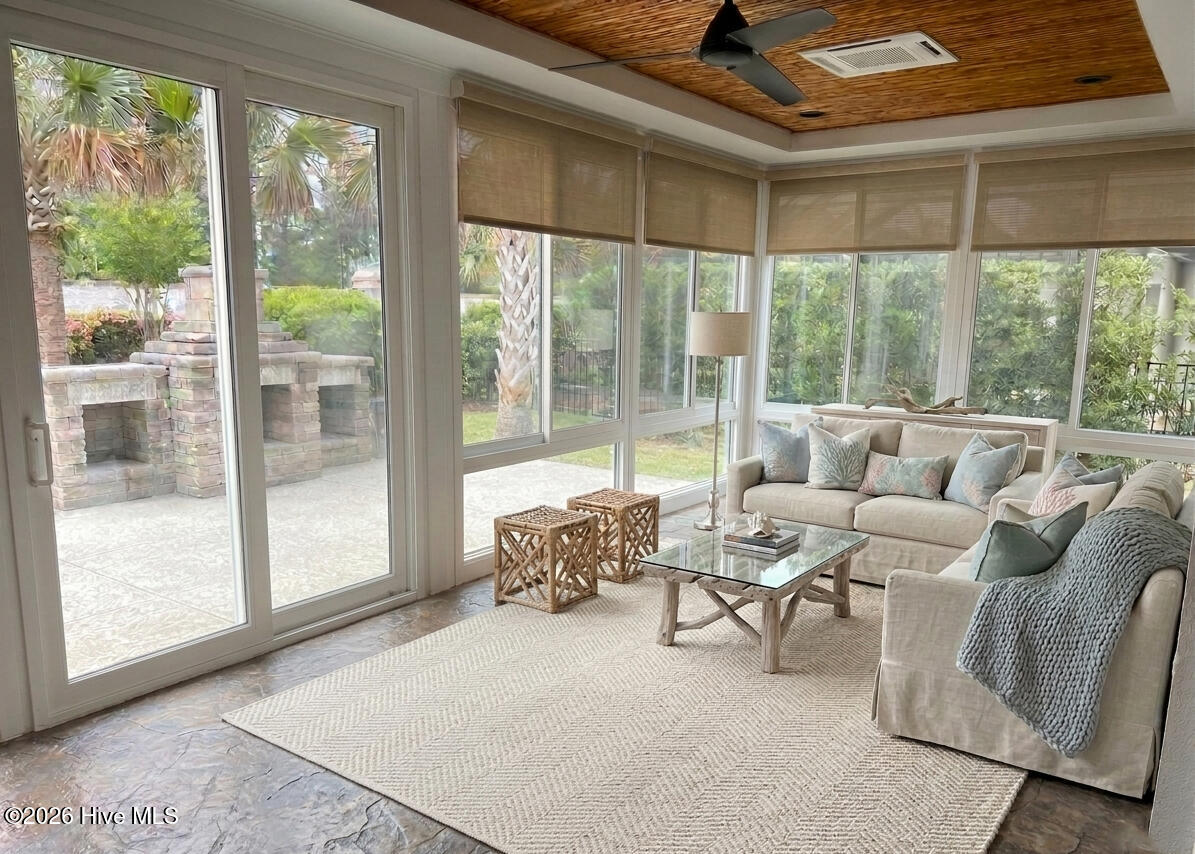 A standout feature of the home is the large enclosed climate-controlled sunroom with Tambour wood ceiling, an extension of the living space that invites year-round enjoyment. Whether used as a cozy sitting area, reading room, or entertaining space, it opens directly to a patio with an outdoor fireplaceperfect for quiet mornings, evening gatherings, and relaxed weekends at home. Professionally landscaped grounds, irrigation, and outdoor lighting complete the serene setting.
