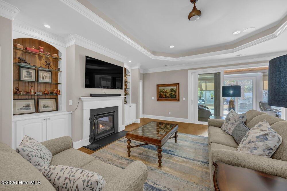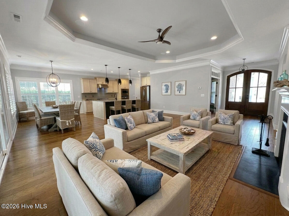 Tucked within the private, gated area of Banyan Bay in Brunswick Forest, this beautifully crafted, move-in ready home offers a calm, polished lifestyle in a mature, private setting with HOA-included lawn maintenance that allows for easy, low-stress living. From the moment you arrive, the arched double front doors make a strong first impression, reflecting the thoughtful architectural details carried throughout the home. Inside, crown molding and refined ceiling treatments add subtle character, creating a space that feels comfortable and well balanced.