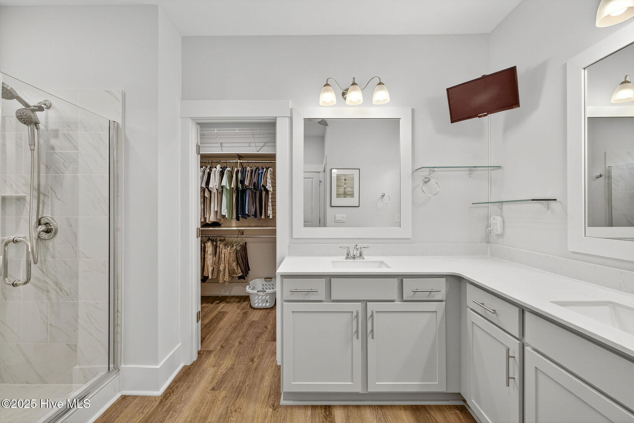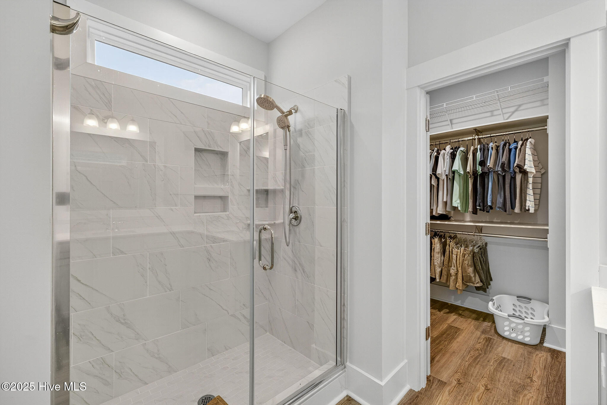 The primary suite provides a peaceful retreat with a tiled walk-in shower, dual vanity, and spacious walk-in closet. Two additional bedrooms offer flexibility for guests or a home office, and custom storage solutions throughout the home ensure every space feels organized and effortless.