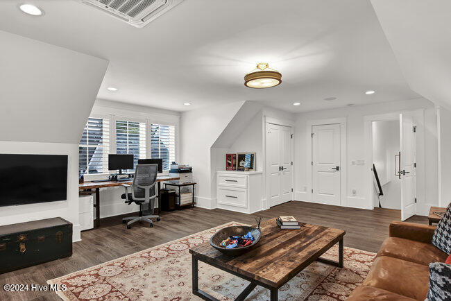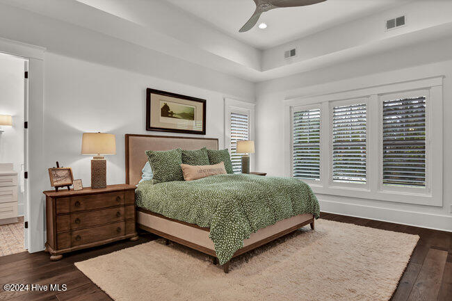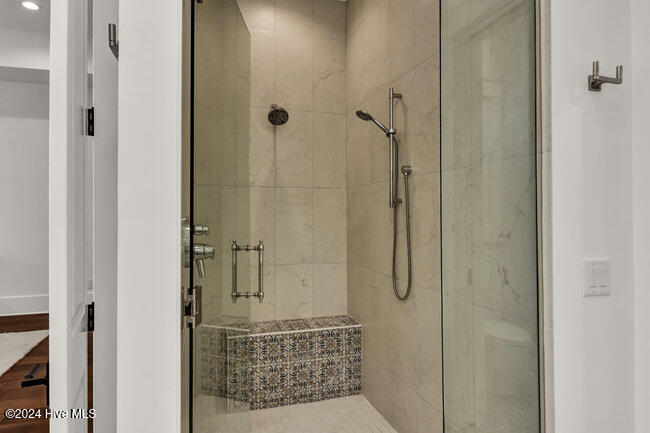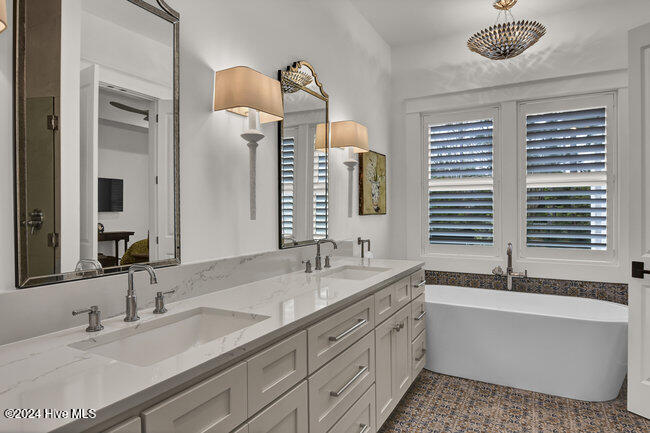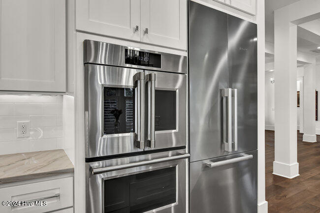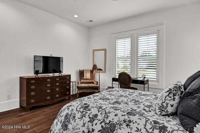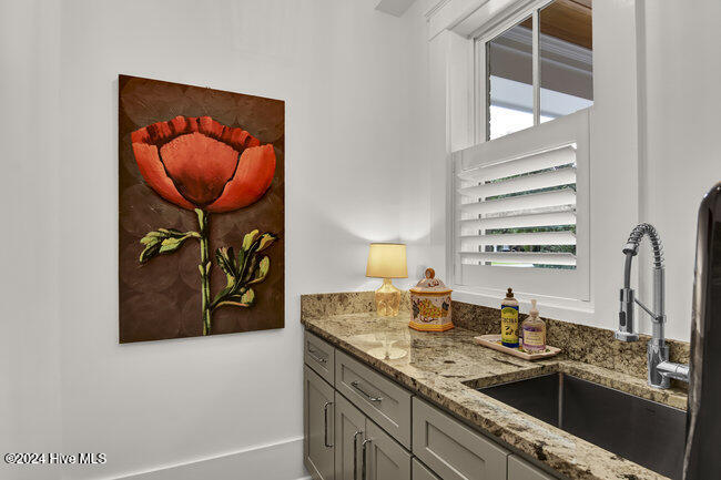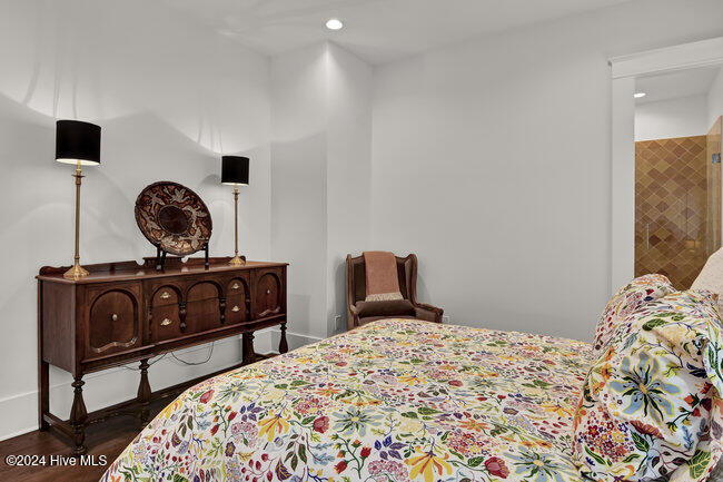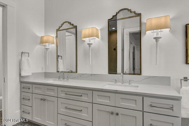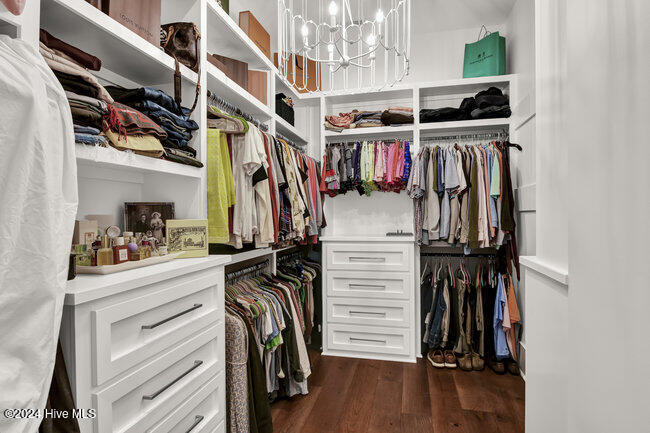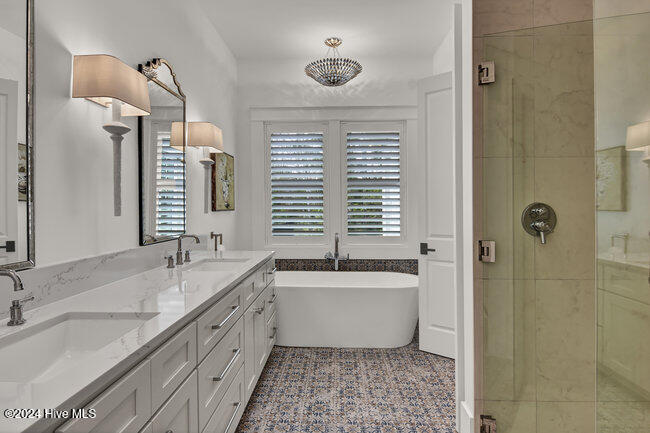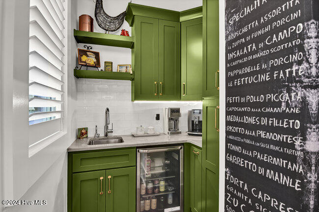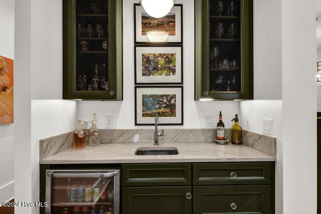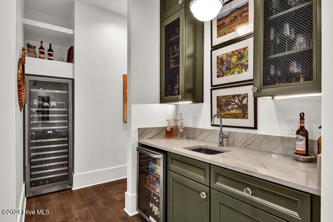 coffee bar, adjacent wet bar, 2 beverage refrigerators, 175-bottle wine storage catering to culinary enthusiasts and a reverse osmosis system for pure drinking water. The first floor is thoughtfully designed, showcasing a luxurious primary suite with a spacious walk-in closet and spa inspired bathroom, ensuring a private sanctuary to unwind and rejuvenate. Two additional first floor bedrooms, each with en-suite baths, ensure both comfort and privacy. A versatile bonus room with its own full bath provides the flexibility to serve as a fourth bedroom, office, or flex space.