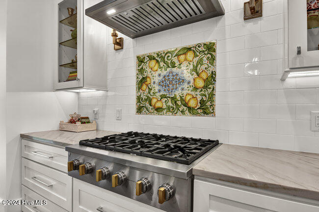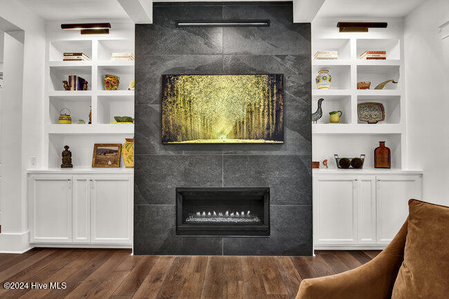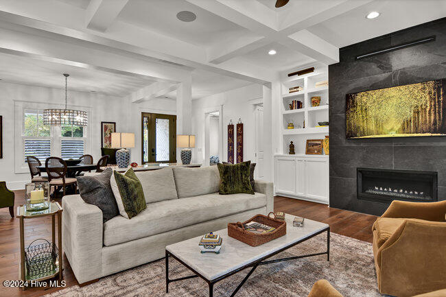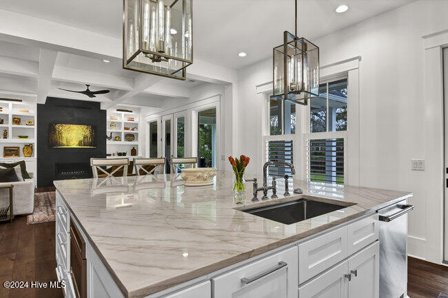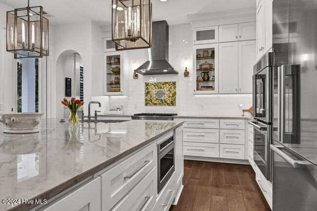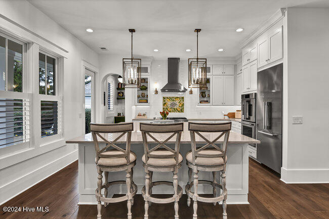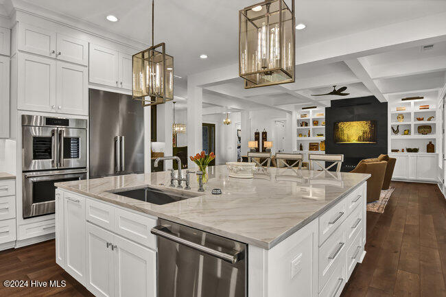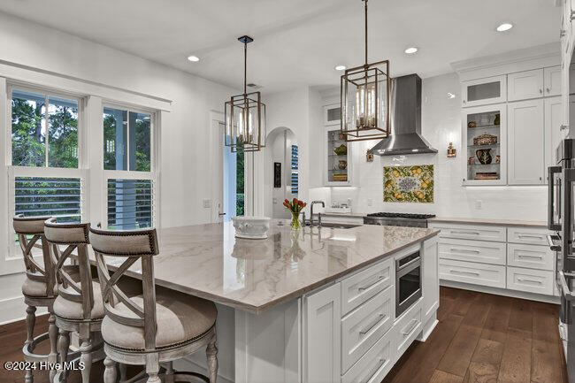 From the moment you step onto the custom herringbone hardwood floors of the entryway, you're greeted by an ambiance of refined elegance. The living room is anchored by a floor-to-ceiling leathered porcelain tile fireplace chase, creating a stunning focal point. The heart of the home is the gourmet kitchen, boasting an impressive oversize center island, Quartzite countertops, GE Monogram and Miele appliances, imported hand-painted tile backsplash, and illuminated ceiling height cabinetry. This space is an entertainment hub, complete with a butler's pantry and
